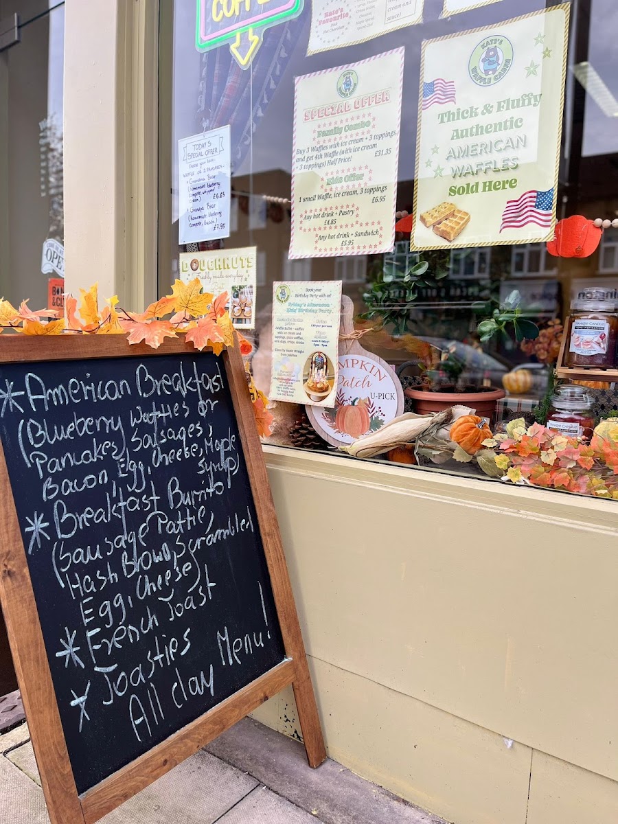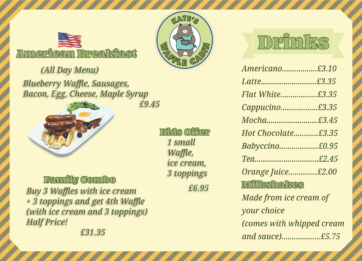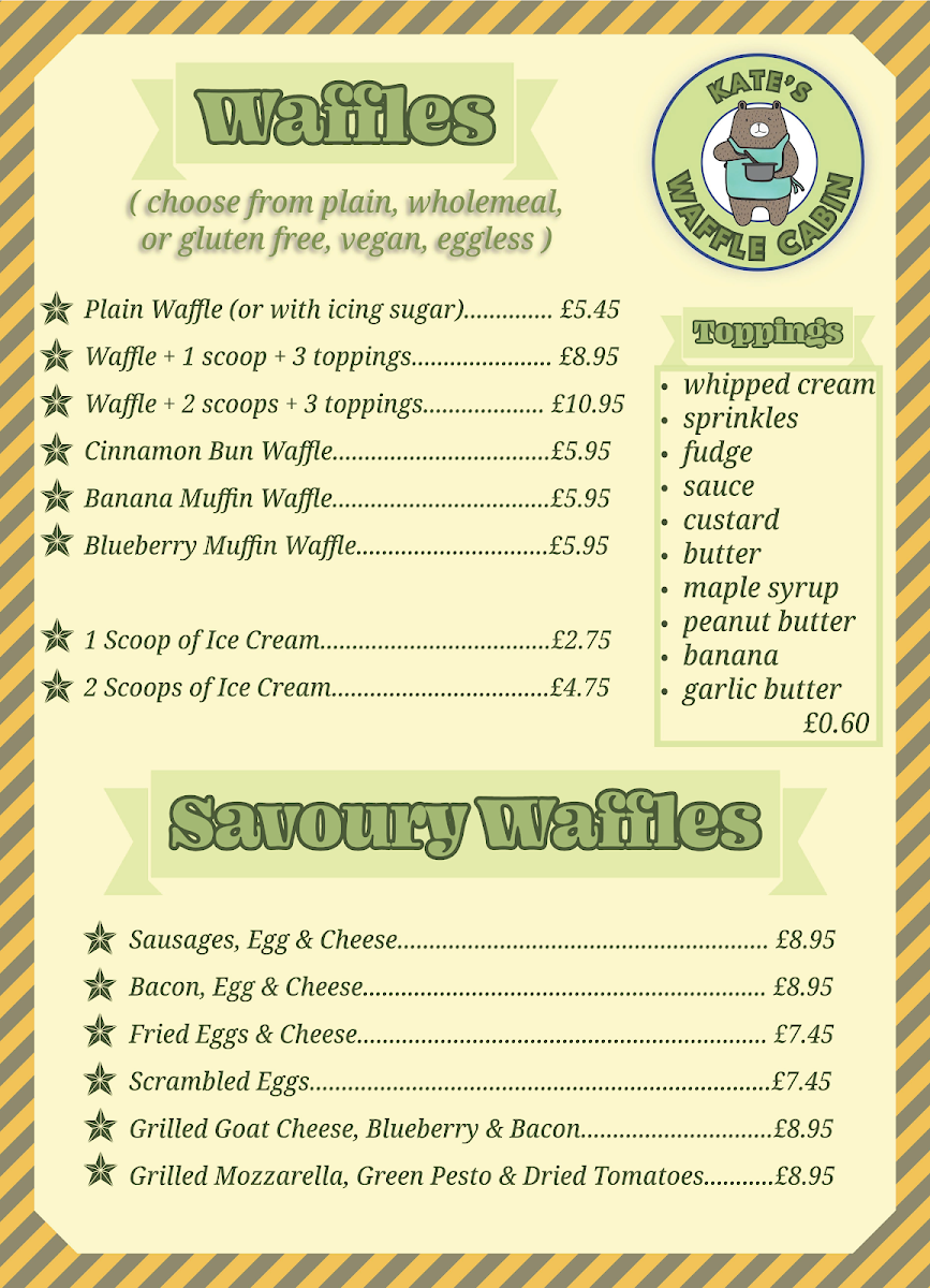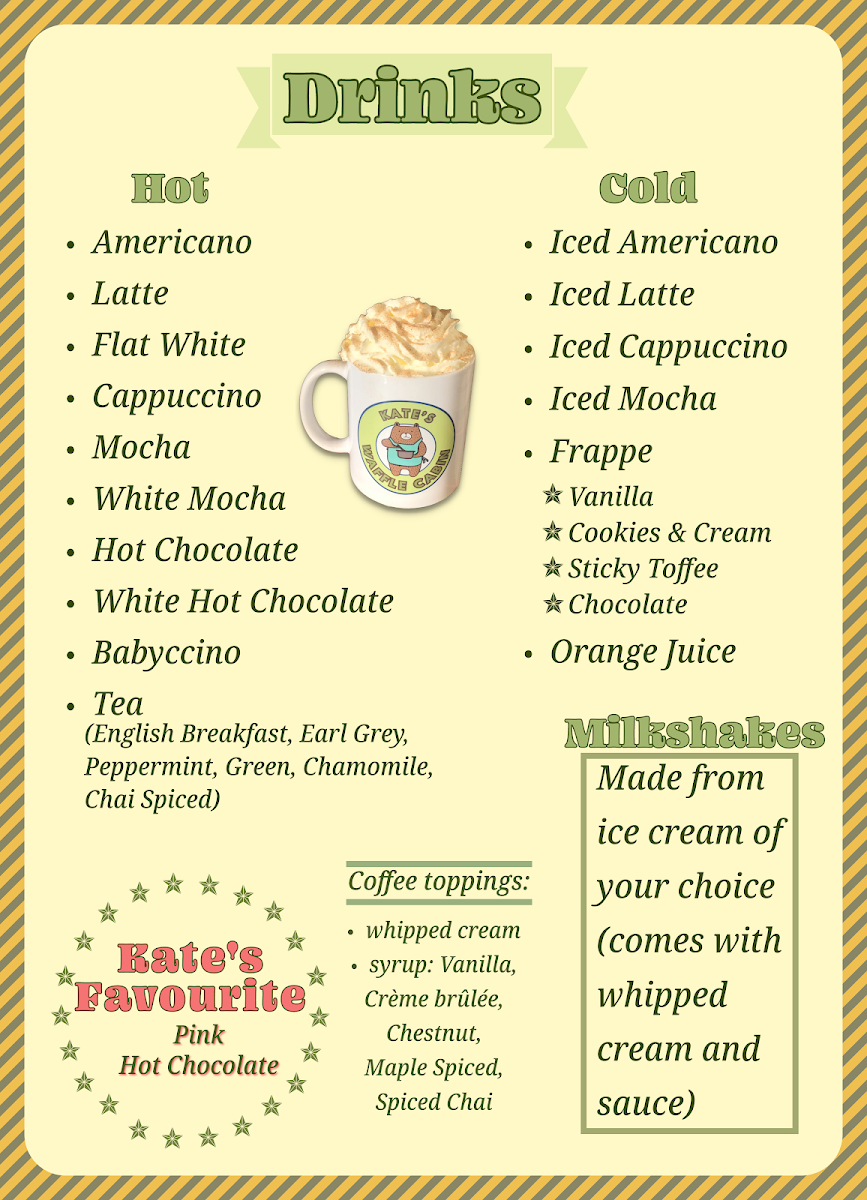 The menu at Kate's Waffle Cabin features a variety of options centered around waffles, complemented by other breakfast and dessert items. It is well-suited for breakfast, snacks, or casual light meals throughout the day.
